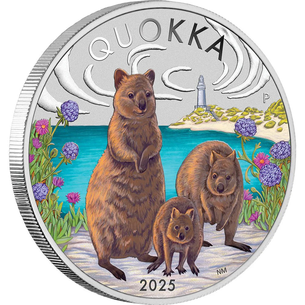 The coin’s coloured reverse portrays a family of happy quokkas standing on white sand amongst colourful foliage. The background depicts the blue Indian ocean and the iconic Wadjemup lighthouse located at the highest point of the island. Included in the design is the inscription ‘QUOKKA’, the 2025 year-date, and The Perth Mint’s ‘P’ mintmark.