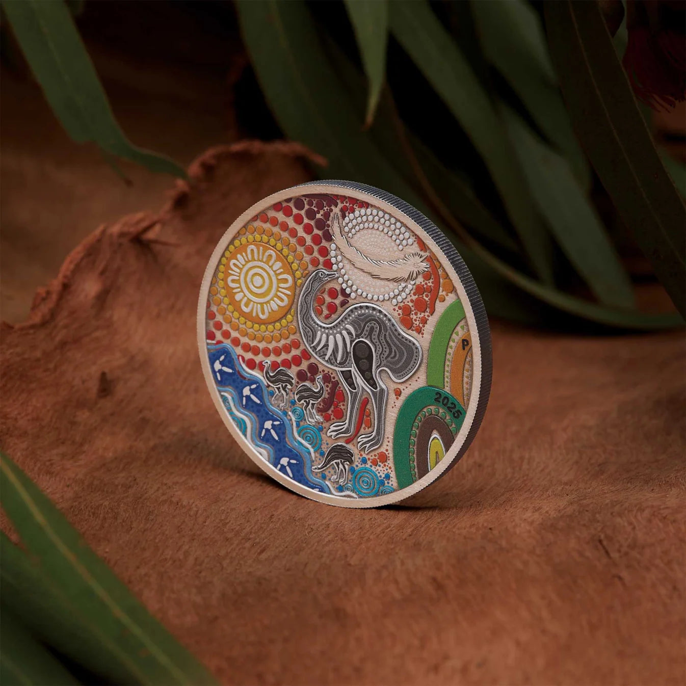 The green and brown arches serve as mountains, while the blue lined pattern features a trail of footprints highlighting the emu’s track and journey through life. This element also represents a flowing river, with the circles inside and around symbolising waterholes. Included in the design is a ‘P’ mintmark and the 2025 year-date.